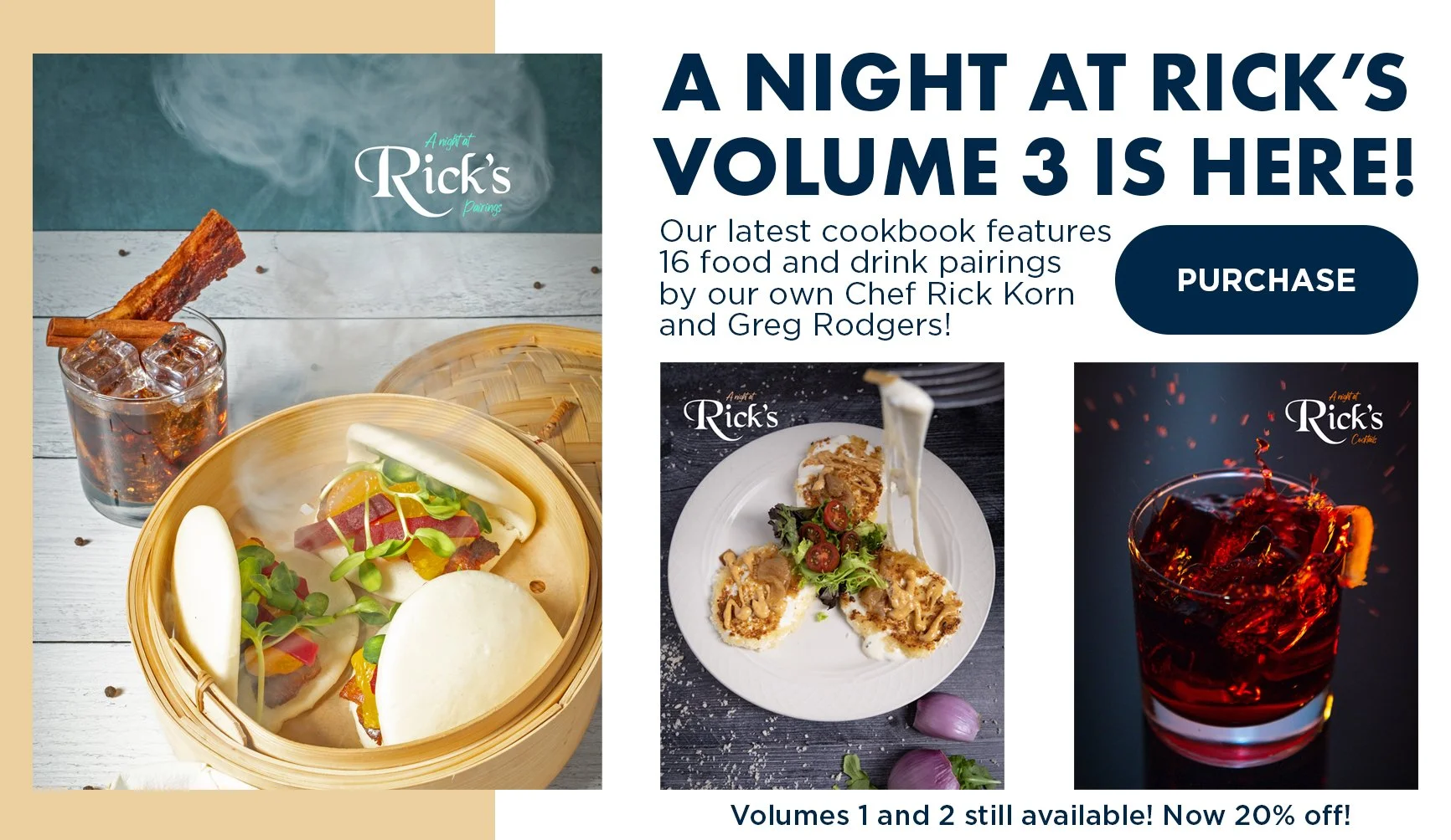 The Rick’s cookbook contains over twenty original recipes from esteemed Chef Rick Korn and beautiful photos by artist Jon Caron! Learn to make your favorite Rick’s dishes from the comfort of your home!